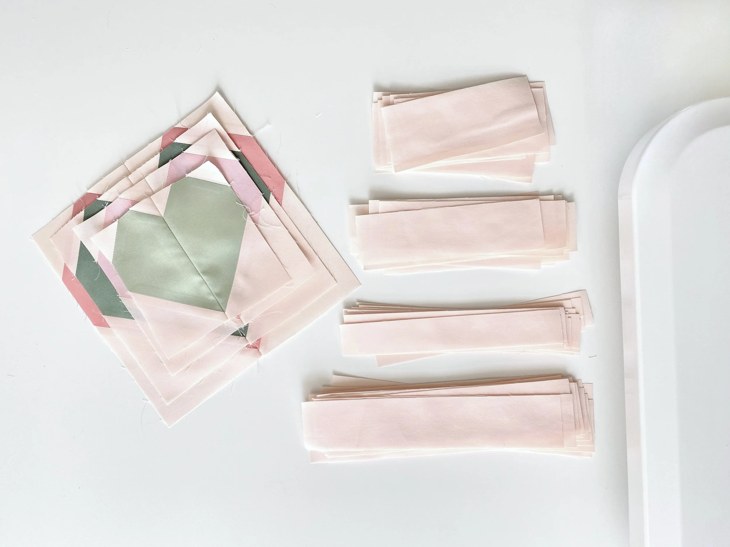 The only tip I have for you this week is lay out your column-related background pieces close to your machine in the order that you have your heart blocks organized. This will make it easy to just grab and sew! I have my blocks stacked together from smallest to largest, so I have my column-related background pieces organized to match with the last in line being the piece that will separate the blocks in the columns.