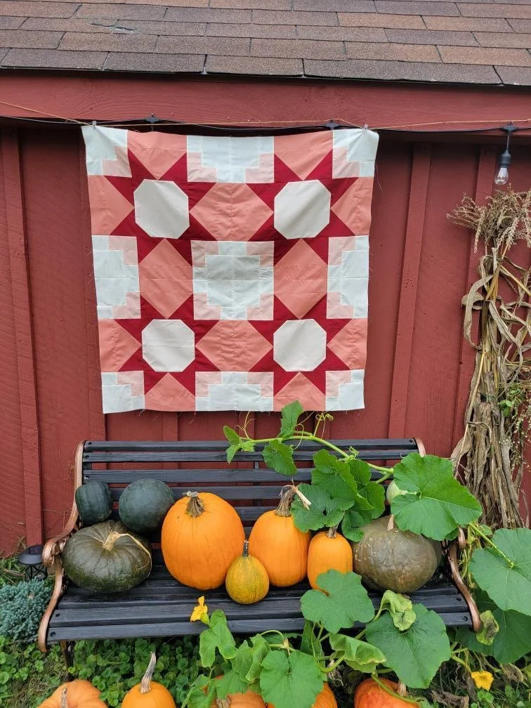 Next there is Emily of @DameandDaneQuiltingCo! Emily created this adorable pink and red baby quilt! It looks so good against that backdrop! That low volume background fabric gives this quilt that extra oopmh!