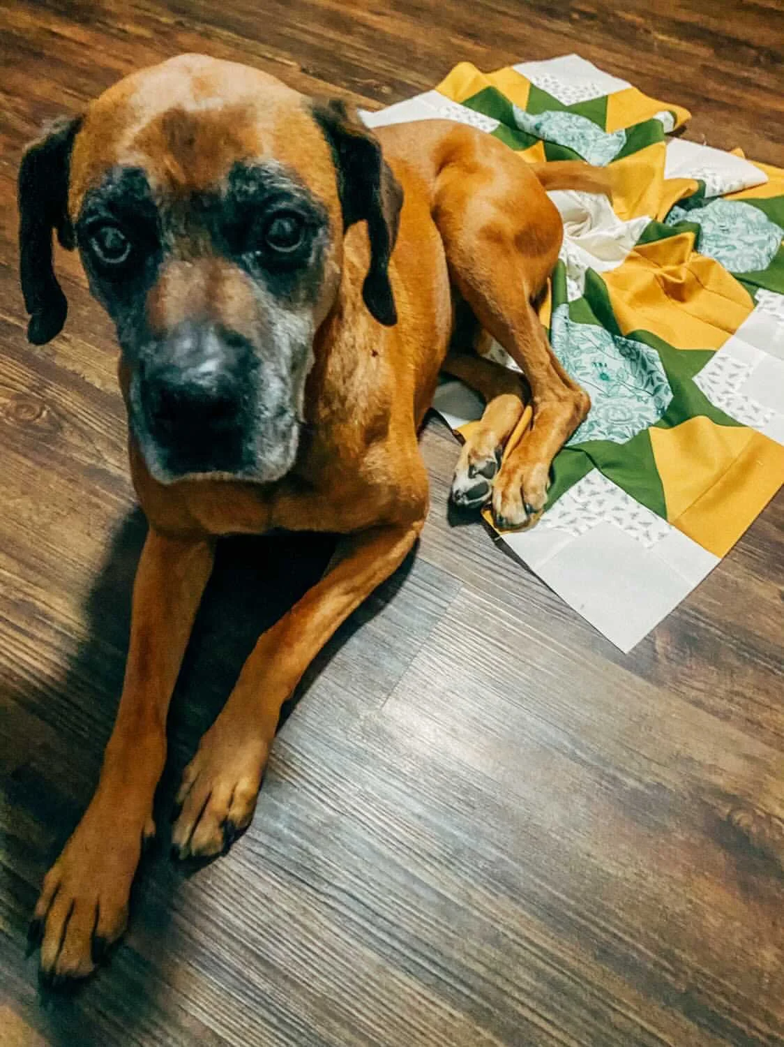 Em of @SimonsenSaysSew with the help of her cute pup! I love the combo of green and gold so much! And that floral print with the bees!? LOVE.
